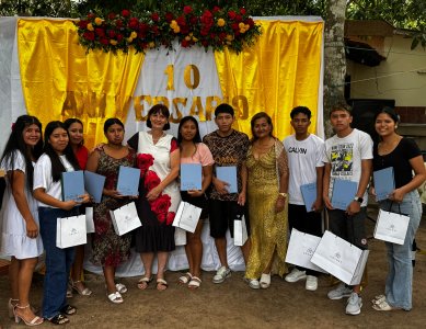 Unser 10-jähriges Jubiläum feierten wir bewusst im „kleinen“ Rahmen – nur mit unseren Projektfamilien, immerhin kommen wir mit 30 Familien allein auf rund 180 Personen. Zu Beginn dankten wir Lehrerin Hilda und Jessica herzlich für ihren treuen Dienst. Durch ihre Liebe, Geduld und Hingabe ist die Hausaufgabenbetreuung zu einem Ort geworden, an dem sich Kinder und Familien angenommen fühlen. Als Zeichen unserer Wertschätzung erhielten beide eine Urkunde und ein kleines Geschenk. Anschließend gratulierten wir elf (!) Abiturienten zu ihrem Schulabschluss und ermutigten sie, ihren weiteren Weg mutig zu gehen. Jeder bekam ein kleines Erinnerungsgeschenk. Besonders freuten wir uns auch über vier junge Frauen aus dem Programm „Beca Unitec“, die ihre Ausbildung erfolgreich abgeschlossen haben. Alle Kinder erhielten eine Tasse mit ihrem Namen und dem Projektlogo, und jede Familie bekam, wie jedes Jahr, einen Lebensmittelgutschein. Nach einigen Dankesreden endete ein schöner Nachmittag voller Dankbarkeit, Freude und Hoffnung, mit einem Gruppenfoto und der gemeinsamen Jubiläumstorte.